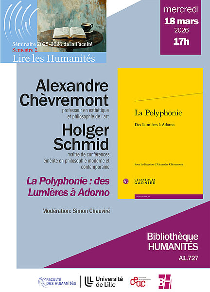 Mercredi 18 mars 2026, 17h-18h30, Alexandre Chèvremont présente le livre La Polyphonie: des Lumières à Adorno (Classiques Garnier, 2025) dont il est éditeur et contributeur. Il est accompagné de Holger Schmid (contributeur). La séance est modérée par Simon Chauviré (doctorant en esthétique et philosophie de l'art).