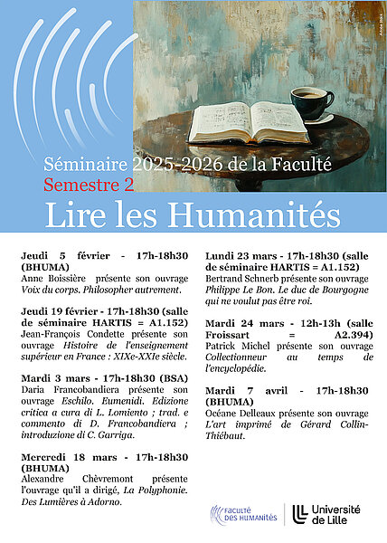 Le séminaire la Faculté des Humanités reprend en cette rentrée universitaire 2025-2026. Il a pour enjeu de présenter à tous, enseignants, enseignants-chercheurs et étudiants, les ouvrages récemment publiés par les chercheurs et chercheuses de la Faculté et donner un aperçu des recherches en cours dans les laboratoires et départements de la Faculté.
